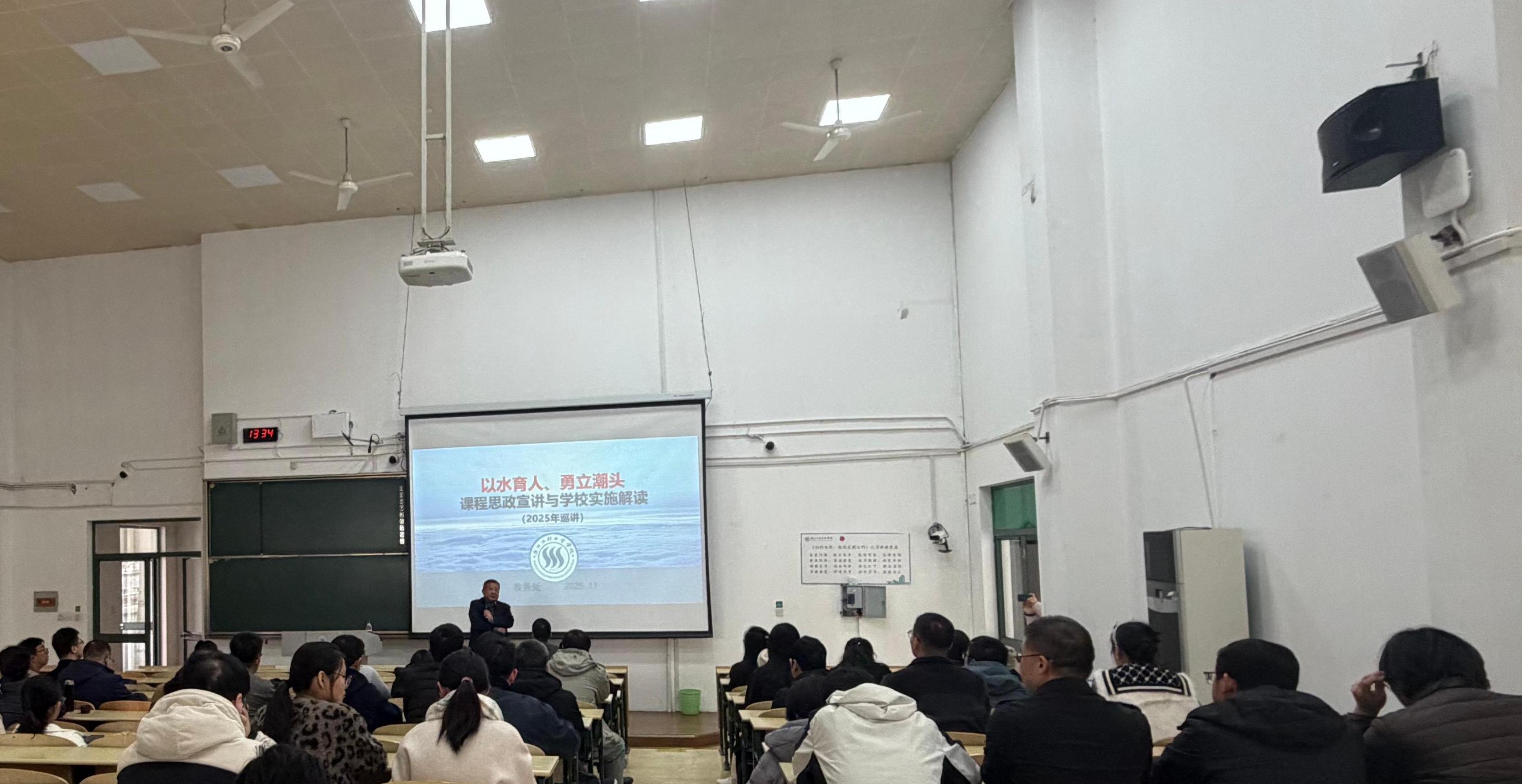 12月10日下午,环境学院与建筑工程学院在钱塘校区教C阶101教室联合举办课程思政专题宣讲会。会议特邀教务处万军处长围绕课程思政的内涵要义与学校实践路径进行深入解读与交流,两院全体教师参加。万军处长以“以水育人、勇立潮头”为题作课程思政专题报告。他系统梳理了课程思政的缘起与发展,回顾了浙水院课程思政建设的探索历程,并结合学校下一阶段深化推进的计划,全面阐述了课程思政育人功能的重要性与建设方向。万处长强调,教师应牢固树立“厚德思政”“思政即育人”的教育理念,准确把握课程思政的实质内涵。他还深入解读了“水院课程思政十点共识”与“课程思政十法”,多维度解析如何将思政元素有机融入课堂教学,包括利用“互